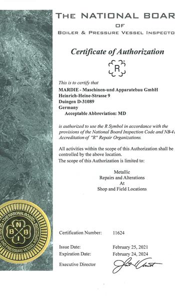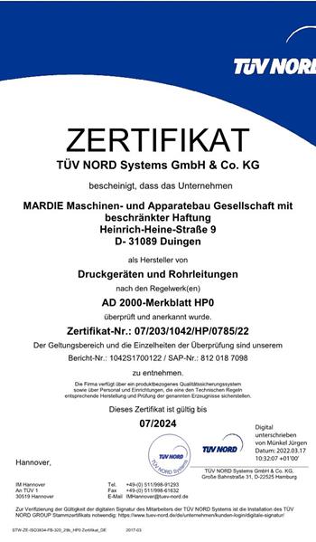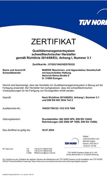 Unter Einbeziehung aller Vorschriften und Regelwerke für druckbeaufschlagte Produkte und Ausrüstungsteile halten wir uns streng an die Vorlagen und die rechtssichere Umsetzung zur Herstellung von Druckgeräten. Durch unser Qualitätsmanagementsystem nach DIN ISO 9001:2015 überwachen wir die Einhaltung der Richtlinien, die regelmäßige Überprüfung unserer Betriebsstätte sowie regelmäßige Schulungen unserer Mitarbeiter.